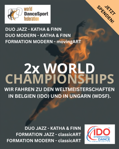Die SGS wird mit classicART Formation Jazz und Modern sowie mit dem Duo Jazz von Katha und Finn vom 28.-30.11. nach De Panne, Belgien zur IDO-WM fahren. Zwei Wochen später geht es für movingART mit der Formation Modern und dem Duo Jazz und Modern von Katha & Finn zur WDSF WM nach Budapest., Ungarn.
